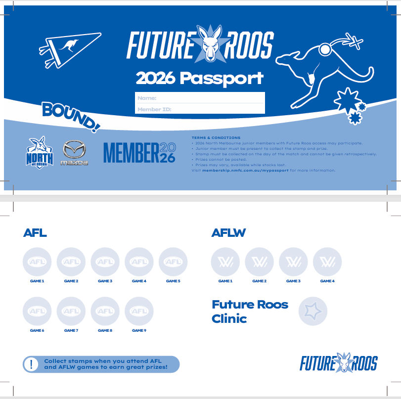 Bring it to the merchandise shop at each home game and have it stamped to collect cool prizes. You even get a prize for coming to the Future Roos Clinic.